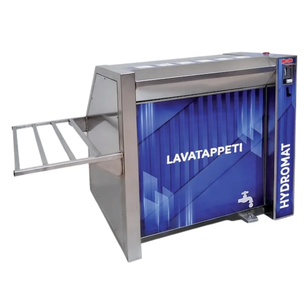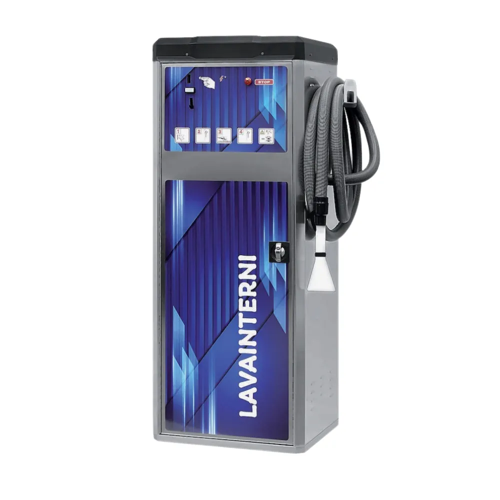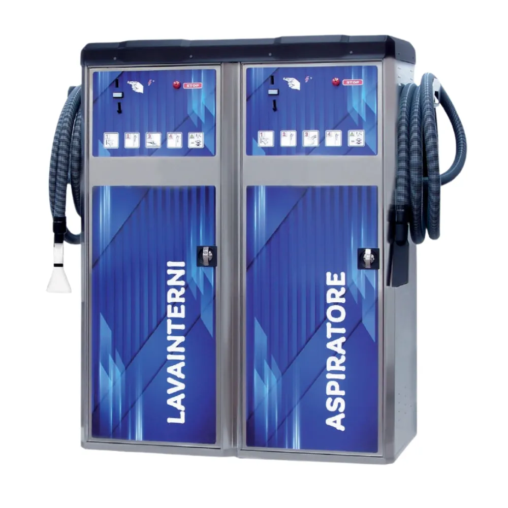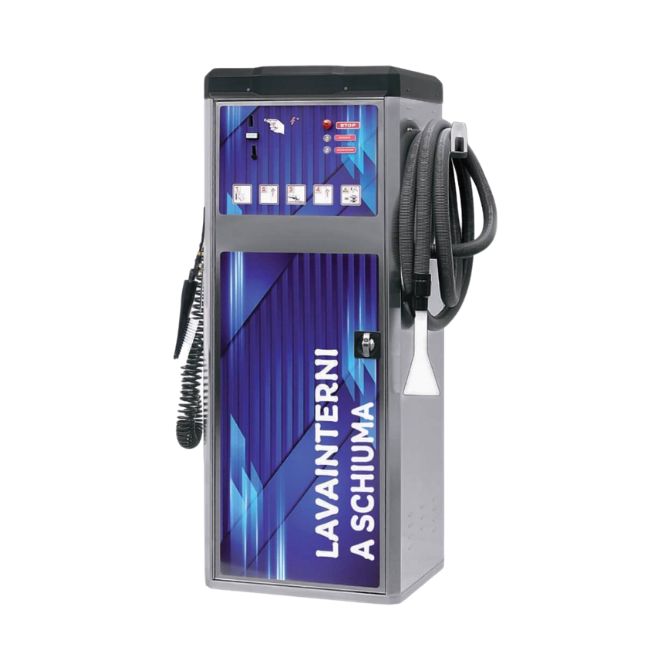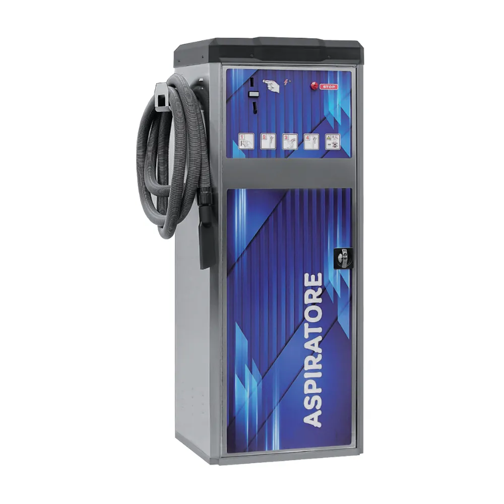 Aspiratore con pulizia automatica del filtro ad aria compressa, gestione dei principali modelli di gettoniere elettroniche e sistemi cashless, contenitore monete lucchettabile, serrature a 3 punti di chiusura,